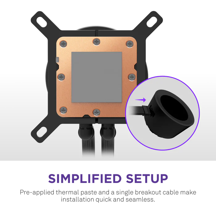 - Easy Installation: Pre-applied thermal paste and a single breakout cable from the pump cap speed up installation and reduce cable clutter.